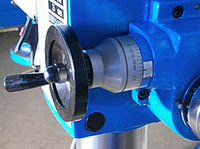 Вертикальный шпиндель снабжен звездчатой рукояткой быстрой подачи пиноли, у основания которой расположена легко читаемая миллиметровая линейка. На рукоятке расположен переключатель на микрометрическую подачу. Маховик микрометрической подачи вынесен на фронтальную часть фрезерной головки и снабжен нониусом.
