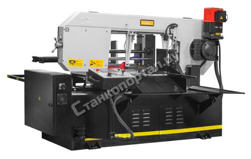 Автоматический ленточнопильный станок, предназначен для пиления труб максимальным диаметром 460 мм и прямоугольной профильной заготовки 650x350 мм под углом 90°. На автоматических станках возможна работа как в ручном режиме, когда каждая операция выполняется вручную посредством нажатия соответствующей кнопки, так и в автоматическом режиме, когда станок выполняет весь цикл резания (зажим заготовки – подвод заготовки – запуск пилы – опускание рамы – остановка пилы – подъем рамы – отжим тисков). В последнем случае оператор должен лишь обеспечить подачу заготовок, предварительно настроив шкалу на дисплее необходимой длины получаемых заготовок и запустить цикл пиления кнопкой «Пуск».