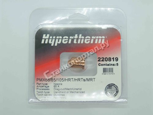 Сопло арт. 220819 используется в системе Hypertherm Duramax при стандартной резке вручную или на станке с ЧПУ. Рабочий диапазон токов данного расходника – 45-65 Ампер. Замену сопла следует выполнять одновременно с электродом, согласно оригинальному мануалу.