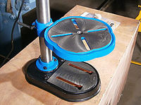 Для закрепления заготовки станок MetalMaster DPH-16L оборудован круглым литым столом с крепежными пазами. Стол перемещается вдоль опорной колонны и фиксируется винтовой ручкой. Крепление рабочего стола предусматривает возможность его наклона. Стол оснащен шкалой-угломером, позволяющим задавать угол поворота заготовки. В случае работы с габаритными заготовками стол отводится в сторону и закрепление детали осуществляется на опорной плите, представляющей собой литой прямоугольный рабочий стол с продольными Т-образными пазами.