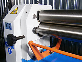 Чугунная станина определяет высокую точность и долговечность станка. Валы изготовлены из высококачественной стали. Зажим листа между приводными валами осуществляется вручную. Также вручную подается вал, формирующий радиусный изгиб заготовки.